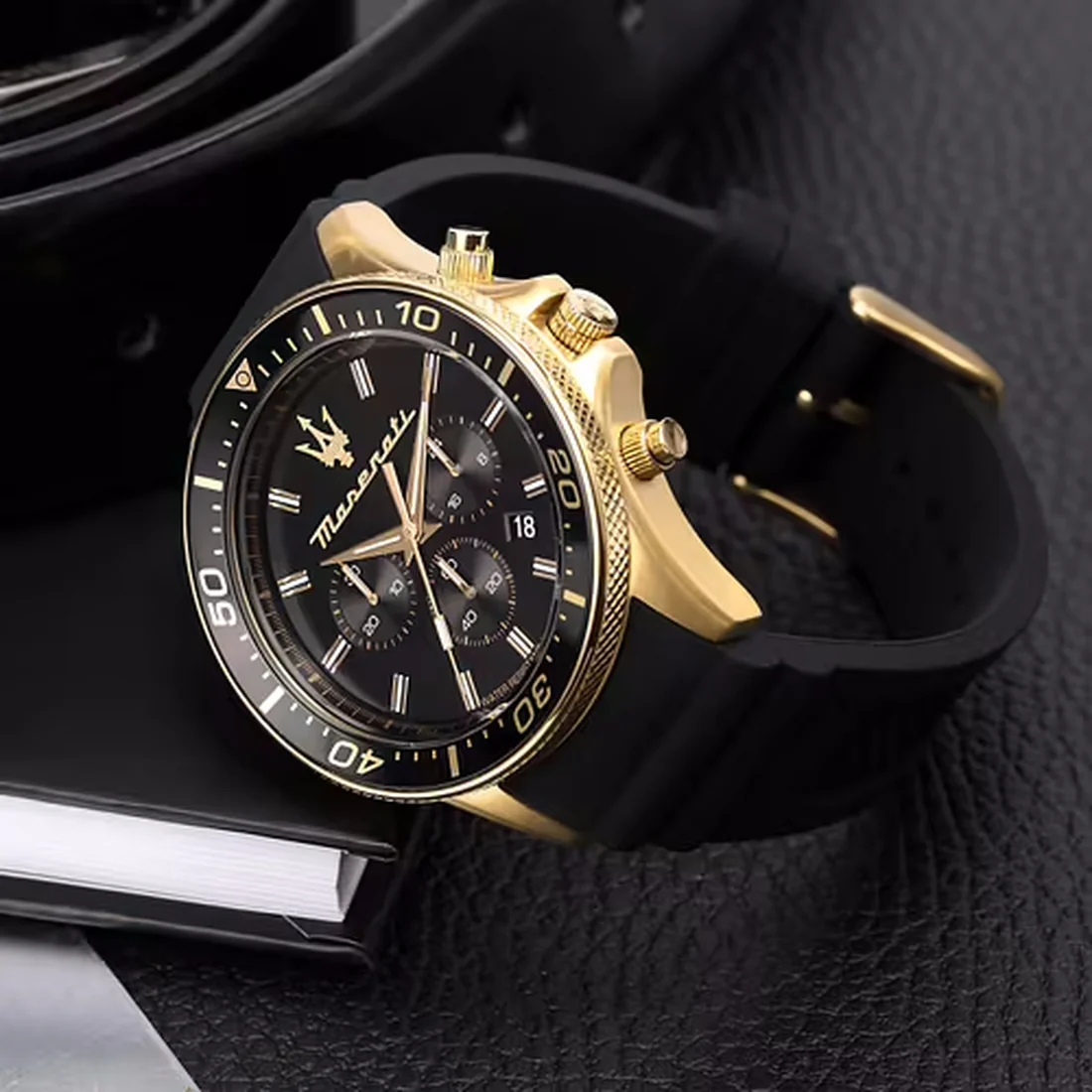 Orologio Maserati Sfida quadrante nero dettagli oro e cinturino in gomma R8871640001